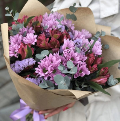 Чудесный букетик из хризантем, статицы и альстромерий с добавлением веточек эвкалипта